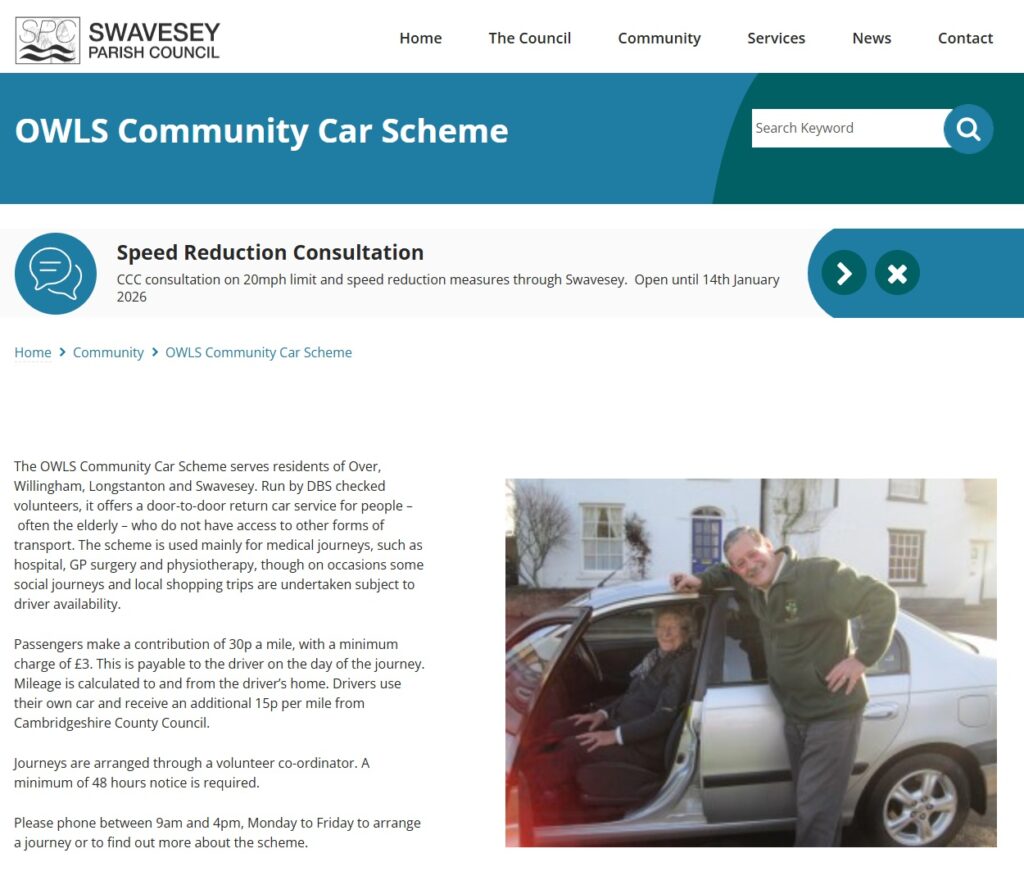 The OWLS Community Car Scheme serves residents of Willingham, Over, Longstanton and Swavesey. Run by DBS checked volunteers, it offers a door-to-door return car service for people – often the elderly – who do not have access to other forms of transport. The scheme is used mainly for medical journeys, such as hospital, GP surgery and physiotherapy, though on occasions some social journeys and local shopping trips are undertaken subject to driver availability.