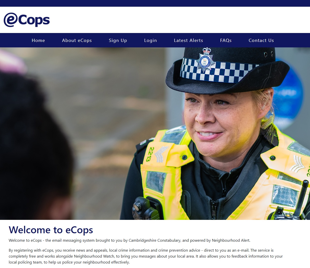 Welcome to eCops – the email messaging system brought to you by Cambridgeshire Constabulary, and powered by Neighbourhood Alert.
